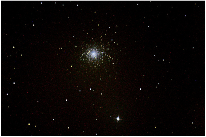 M 13 is one of the best-known globular clusters in the northern celestial sphere. At a distance of 25,000 light years, its angular diameter of 23 arc minutes corresponds to an area of 150 light years. M 13 contains a number of 100000 stars, in his book Galaxies Timothy Ferris speaks even of "more than a million". Toward the center of the stars are about 500 times denser than in the solar neighborhood. The age of M13 has determined Sandage and Arp 24 billion years to 17 billion years around 1960, and later (1962) revised Arp its value to 14 billion years (by Kenneth Glyn Jones).